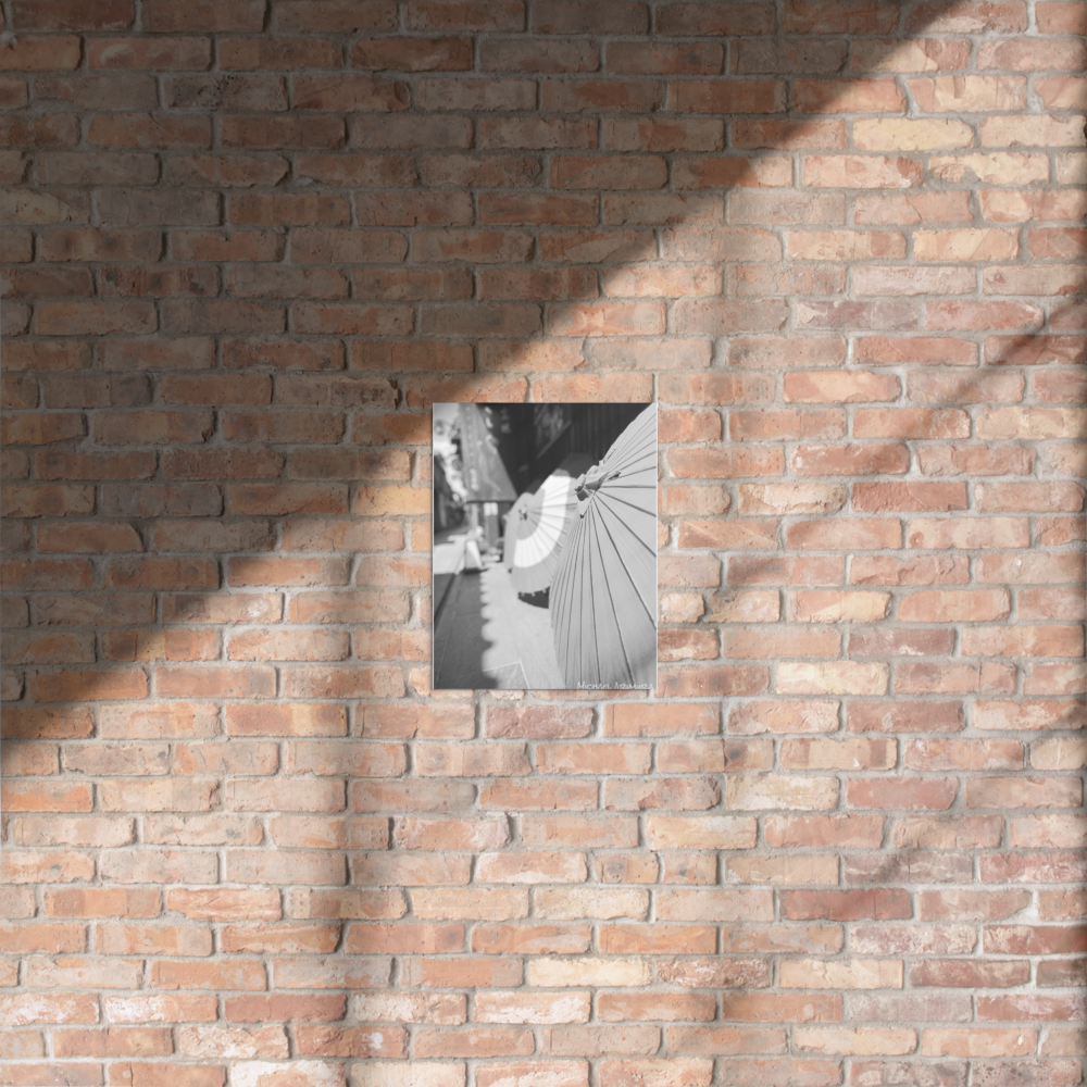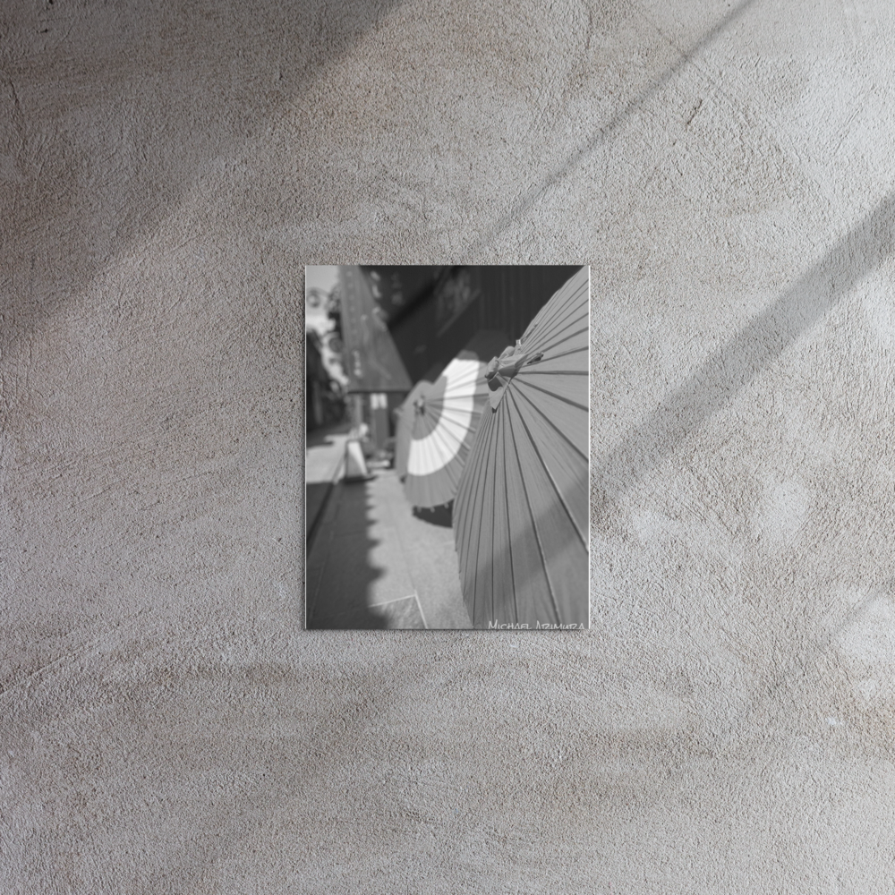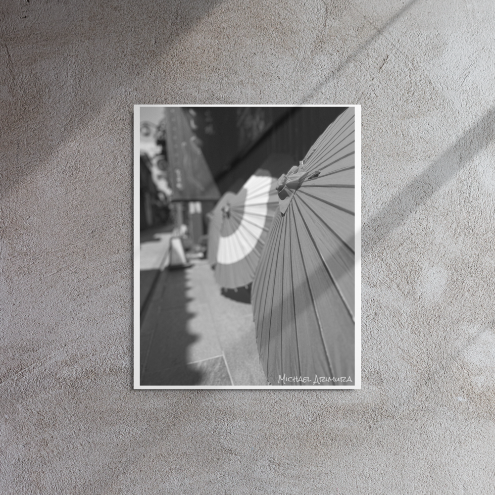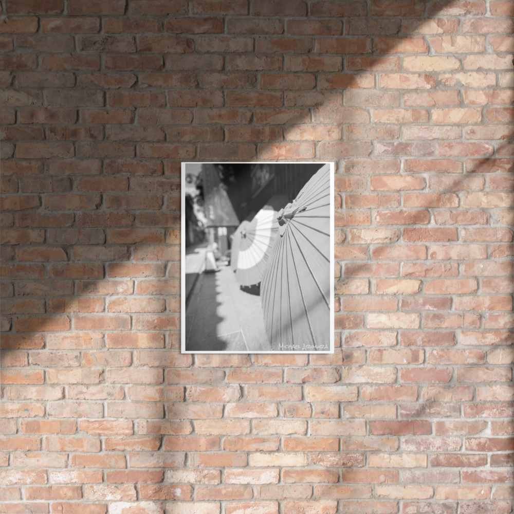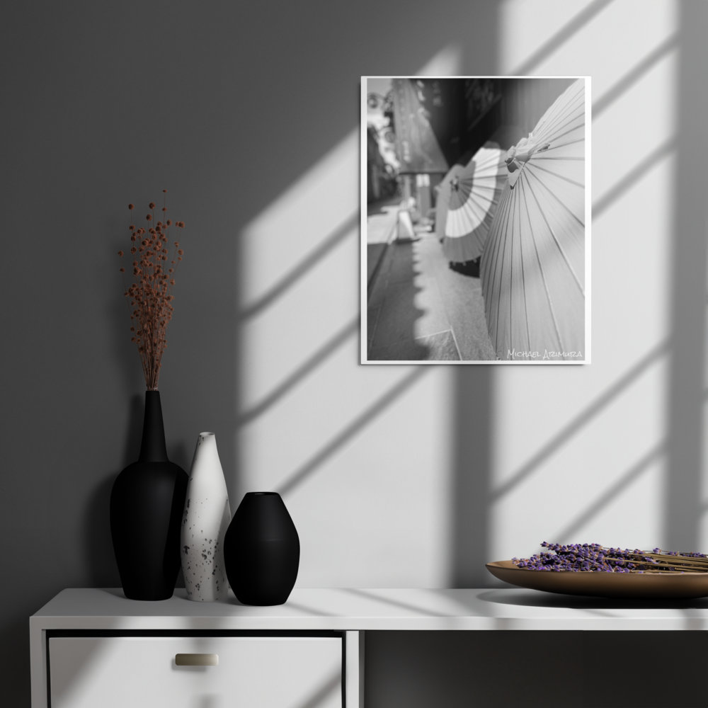 Paper umbrellas rest in quiet alignment, beaming light and shadows along a narrow path. In a small relaxed and empty alley in Kyoto, Japan.