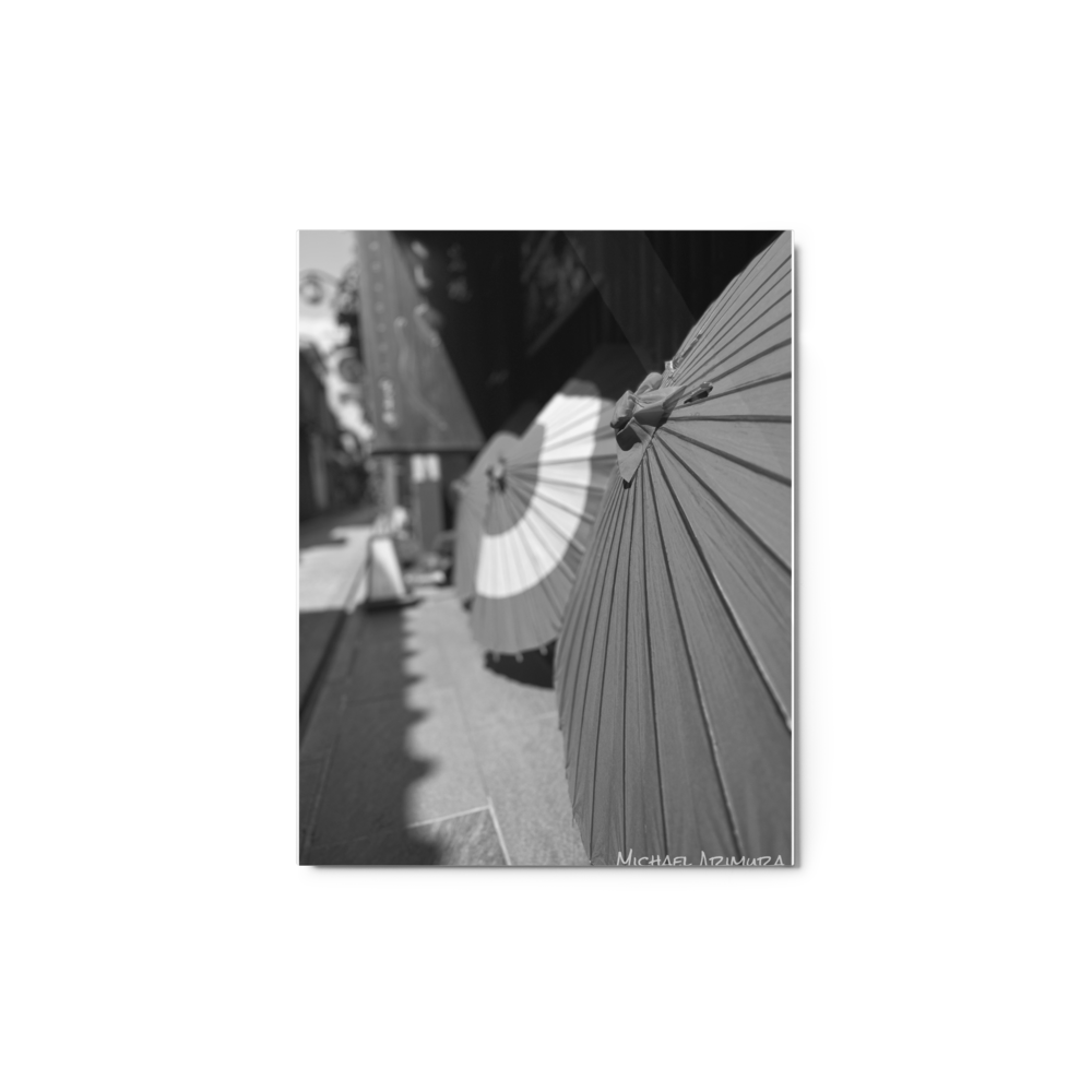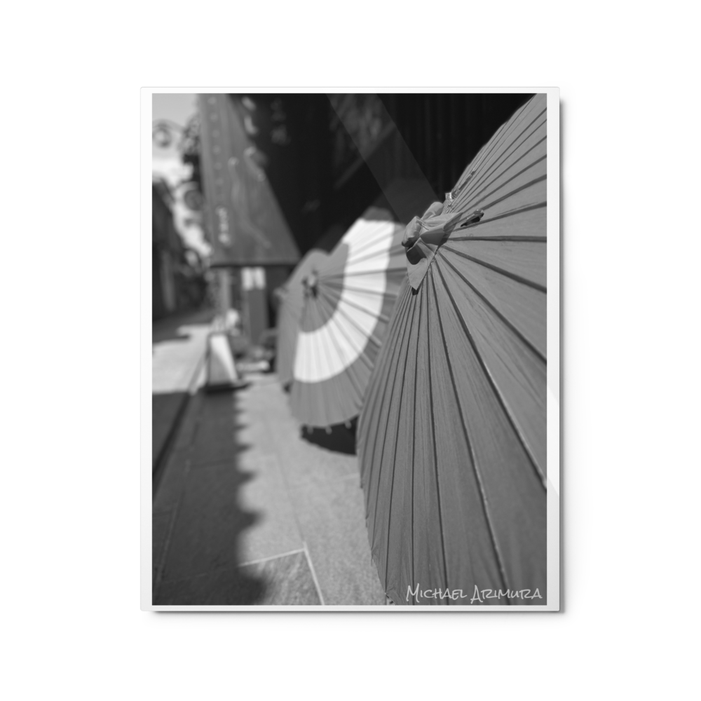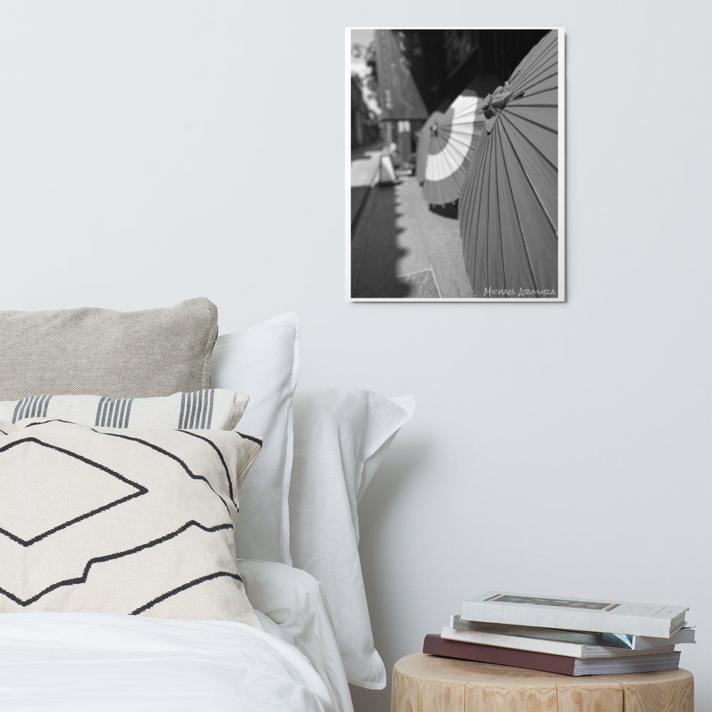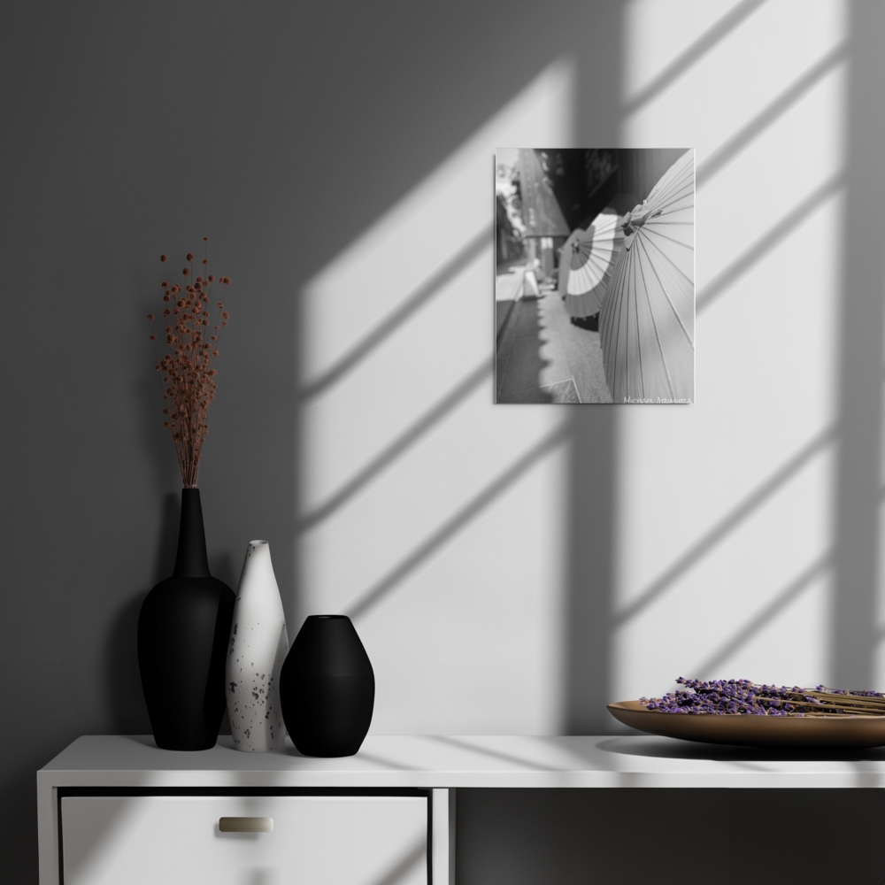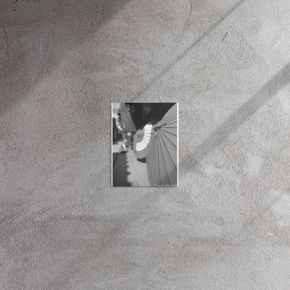Paper umbrellas rest in quiet alignment, beaming light and shadows along a narrow path. In a small relaxed and empty alley in Kyoto, Japan.