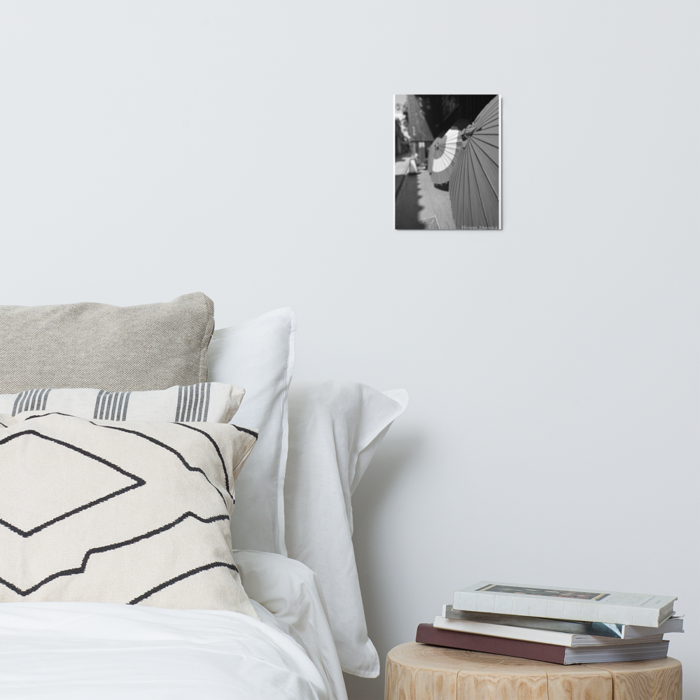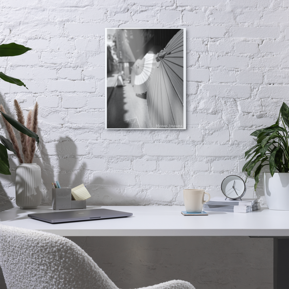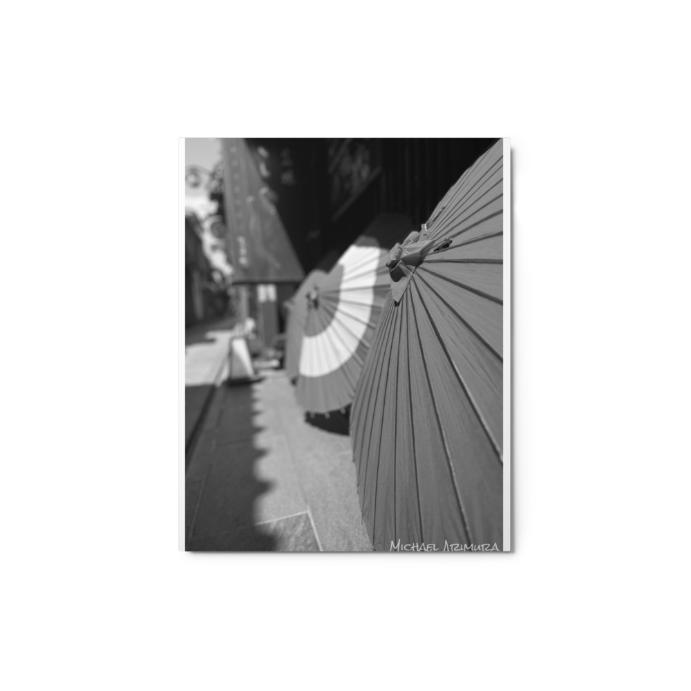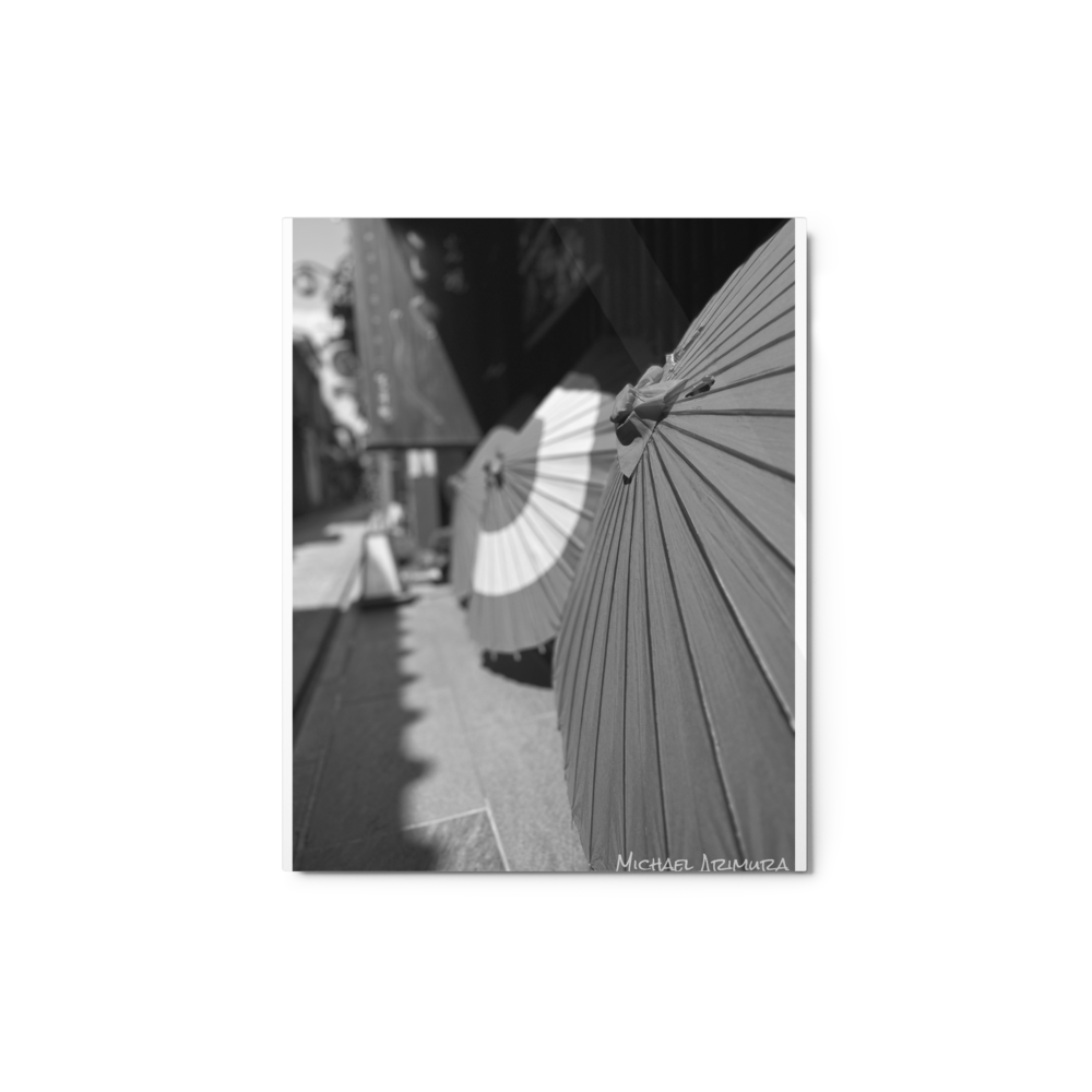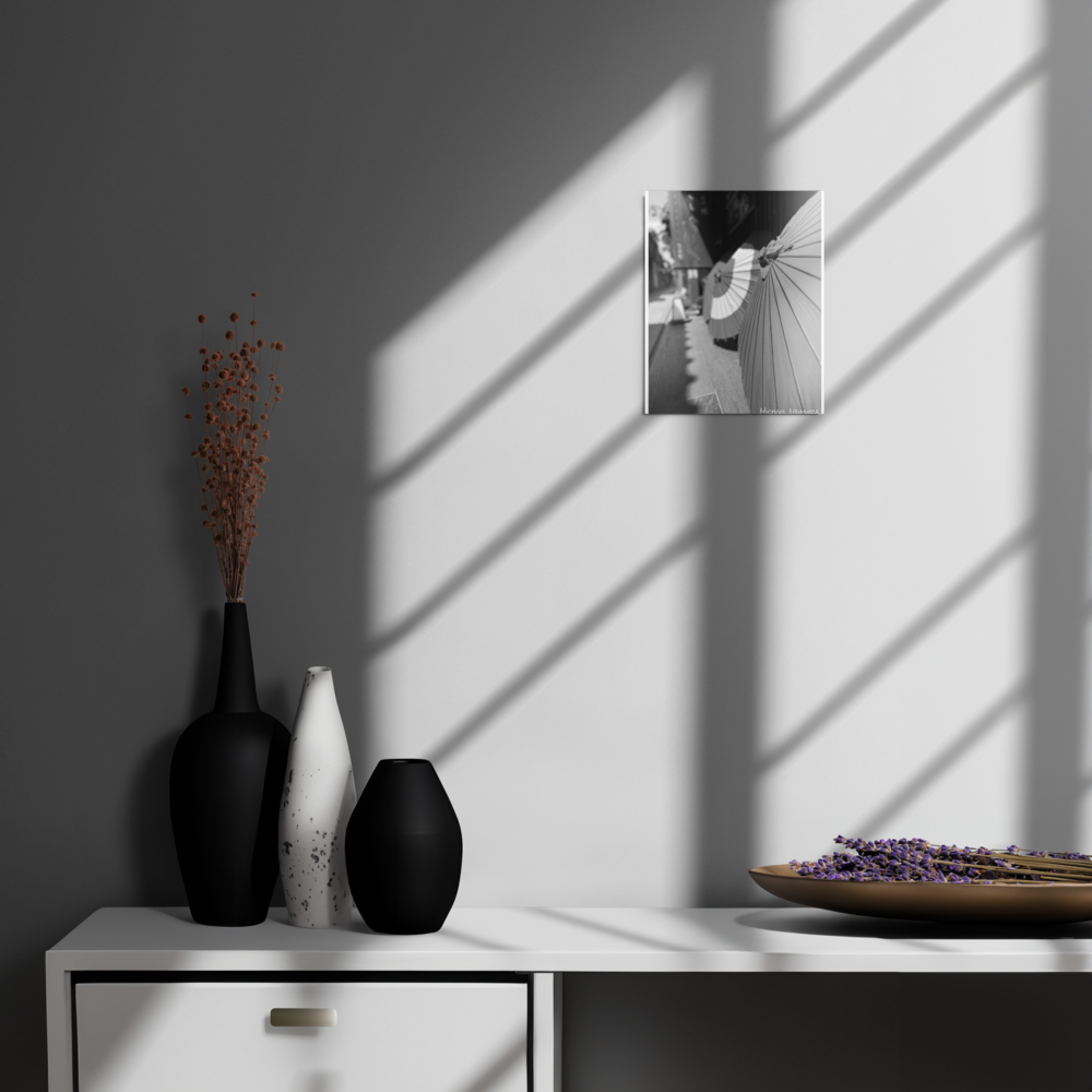 Paper umbrellas rest in quiet alignment, beaming light and shadows along a narrow path. In a small relaxed and empty alley in Kyoto, Japan.