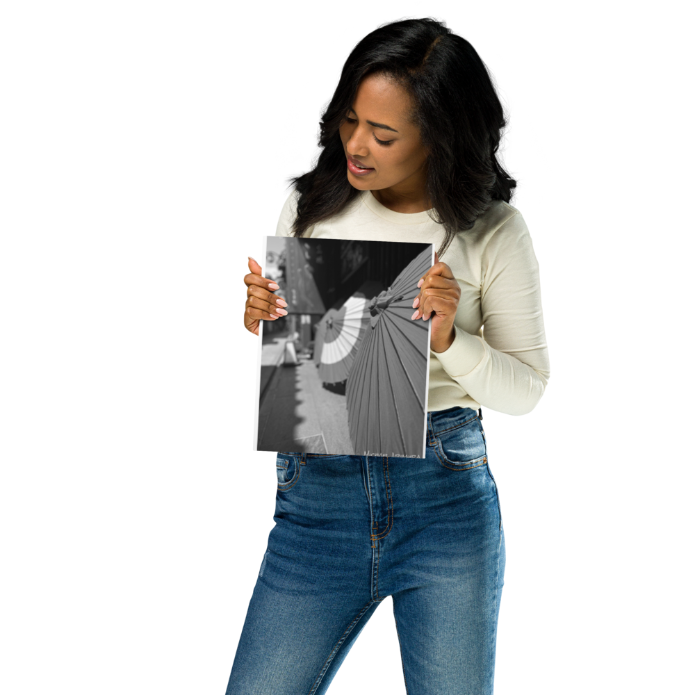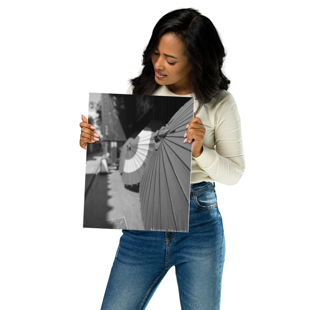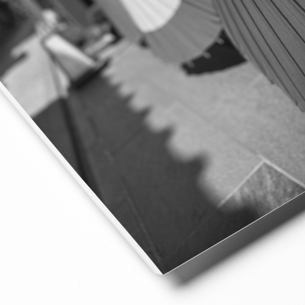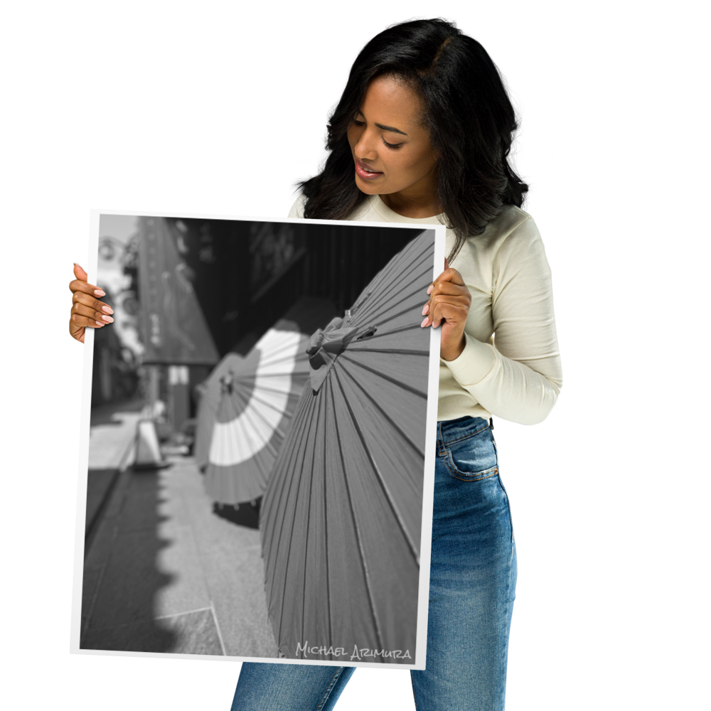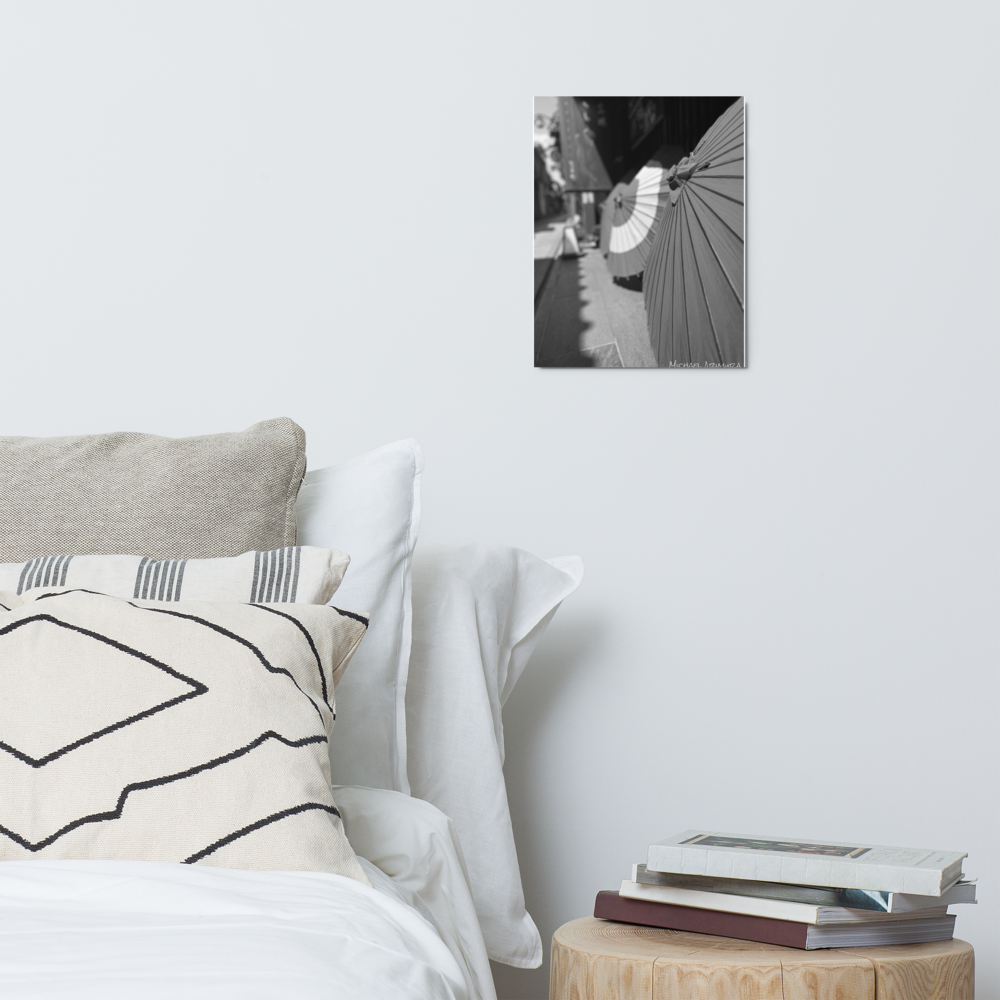 Paper umbrellas rest in quiet alignment, beaming light and shadows along a narrow path. In a small relaxed and empty alley in Kyoto, Japan.